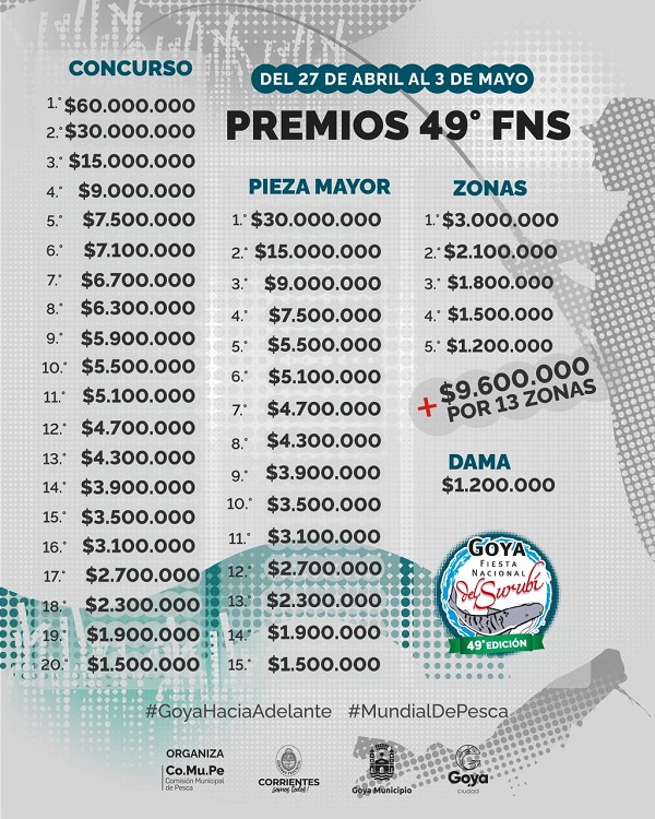 También explicó el alcance de la premiación: “La grilla sigue hasta el vigésimo premio por el concurso y hasta el décimo quinto en Surubí Mayor. Después las zonas, las 13 zonas van a estar premiadas del primero al quinto puesto”.