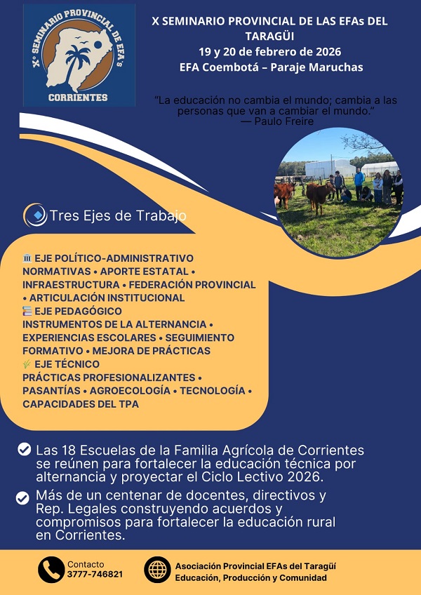 La ASOCIACIÓN PROVINCIAL EFAS DEL TARAGÜÍ invita a la comunidad a participar del Acto de Apertura del Seminario Provincial “EFAs del Taragüí”, que se realizará el jueves 19 de febrero de 2026 en las instalaciones de la Escuela de la Familia Agrícola (EFA) Coembotá, ubicada en el Paraje Maruchas, Departamento de Goya.