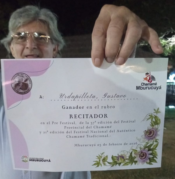 Confirmada su presencia en el festival mayor, el artista expresó su emoción por el logro alcanzado: “Exactamente, esta noche arranca el festival, el 57º Festival Nacional del Auténtico Chamamé Tradicional en Mburucuyá (Corrientes) y tuve la suerte de anoche al conseguir ganar el rubro recitador, cupo para poder estar presente en el escenario junto a todo el conjunto”, expresó Gustavo Urdapilleta.