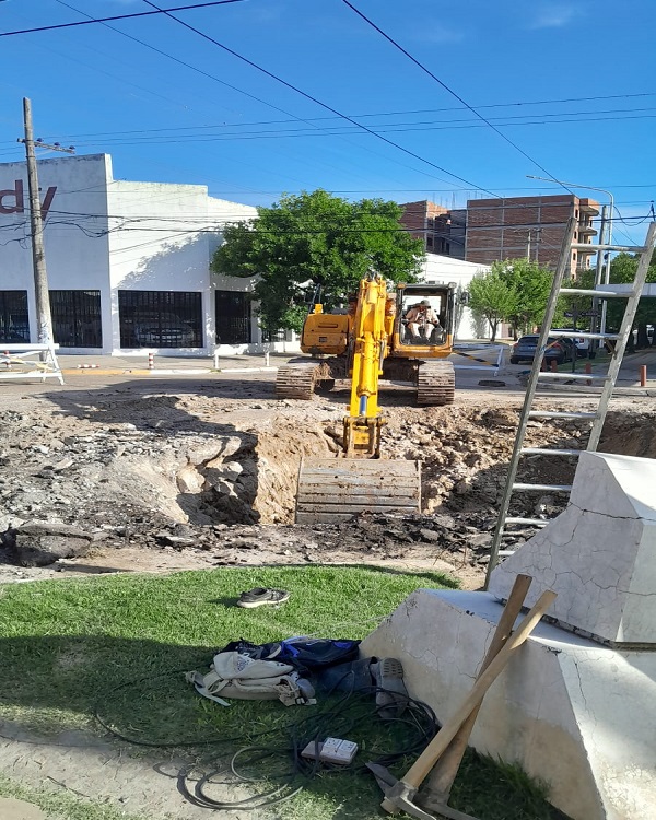 Sobre la intervención actual, detalló: “Y en este caso estamos interviniendo en la bocacalle más precisamente en las acometidas a una cámara de los caños correspondiente a la boca de tormenta de la calle 9 de Julio”.