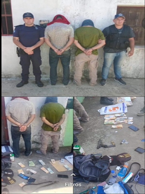Es por ello que tras ser alertado el personal policial de la Comisaria Primera de Esquina junto con las otras dependencias de la zona desplegaron un importante operativo cerrojo en diversos puntos de la provincia que dejo como resultado horas más tarde la localización de ambos sujetos, pero ya en la localidad de Pueblo Libertador frente al hospital de la zona, y gracias a un funcionario (de franco de servicios) junto a la comisaría local lograron la detención de los mismos y en poder de estos recuperar el dinero sustraído, dos arma de fuego una calibre 9 mm., y otras 11.25, además de otra importante suma de dinero de origen dudoso siendo un total de lo secuestrado más de 3 millones de pesos y otras documentaciones, siendo identificados con los apellidos Peralta y Vázquez (ambos mayores de edad oriundos de la Provincia de Buenos Aires).