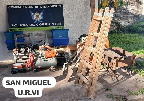 Los distintos trabajos de investigación desplegados, llevó a los investigadores a diligenciar una orden de allanamiento en un domicilio ubicado en la mencionada localidad, “lugar donde hallaron y secuestraron una escalera de madera, una moladora -marca Bosh-, una caladora Blanck Beker, una cepilladora Black Becker, una llave de tubo, una caja con martillo, corta hierro, pinza, barrera y otras, un nivel magnético de 60cm -marca La Mota-, una caja de material como ser placas de hierro, caños, redondos, cuadradas, rectangular, una soldadora, una carretilla, una pala de punta, dos palas anchas, una cuchara de albañilería, una espátula, un taladro percutor -marca Einhel-, un compresor -marca Daewoo- y accesorios, cuatro escuadras soporte magnético -marca Dodo-, dos amoladoras angular de 4,5 pulgadas lineales profesional AS75, una máscara de soldar, una mascara de soldar fotosensible, una pistola de aplique de pegamento, dos sillas de madera, un fratacho de madera de 12×40, una espátula de mago de madera, una espátula de mango de plástico, una caja azul con varios discos diamantado de 4 milímetros y dos caballetes de hierro, los cuales aparentemente estarían vinculadas al hecho que se investiga.”