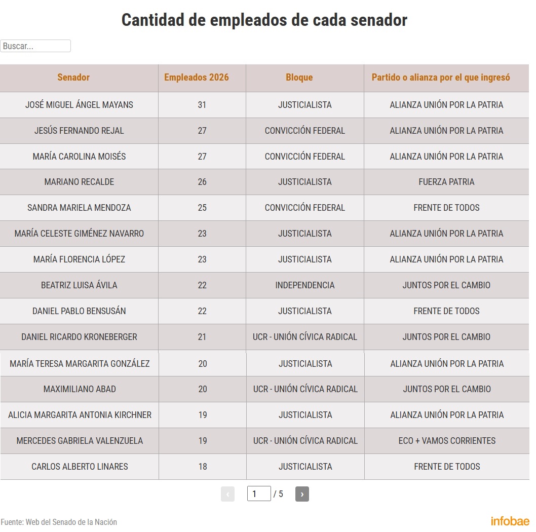 A Mayans, le siguen en el ranking de cantidad de empleados la jujeña Carolina Moisés y el riojano Jesús Fernando Rejal, ambos del bloque Convicción Federal, con 27 empleados cada uno, según el análisis de los datos oficiales hecho por Infobae. Los dos llegaron al Senado en 2023 por Unión por la Patria, aunque en marzo de 2025, conformaron una nueva bancada, como un desprendimiento de ese bloque, aunque suelen votar en sintonía como un interbloque.
