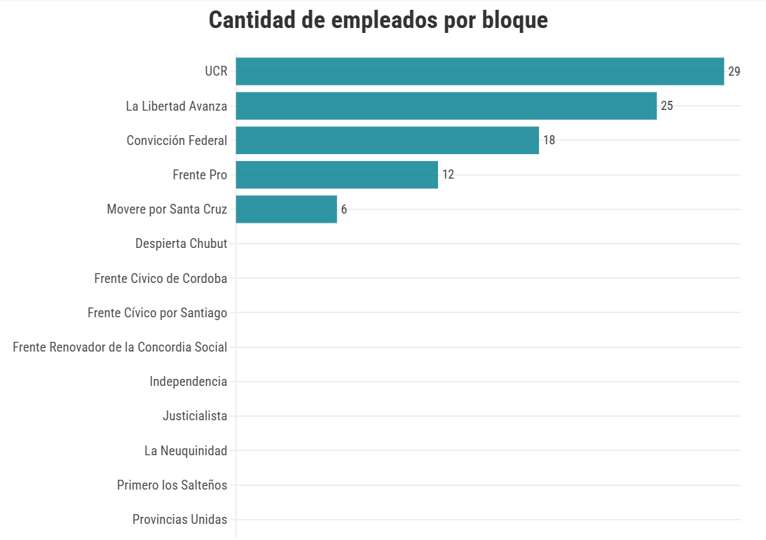 En el otro extremo, sin empleados designados en la web de la Cámara alta hasta ahora, figuran tres senadores de La Libertad Avanza. Sin embargo, esto se debería a una demorar en el trámite de nombramiento.