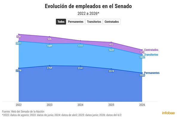El Senado tiene hoy 3.980 empleados bajo distintas modalidades en todas sus dependencias. Es un 23% menos de la cifra registrada en agosto de 2022, cuando sumaban 5.175, entre la planta permanente, la transitoria y los contratados.
