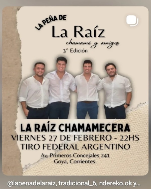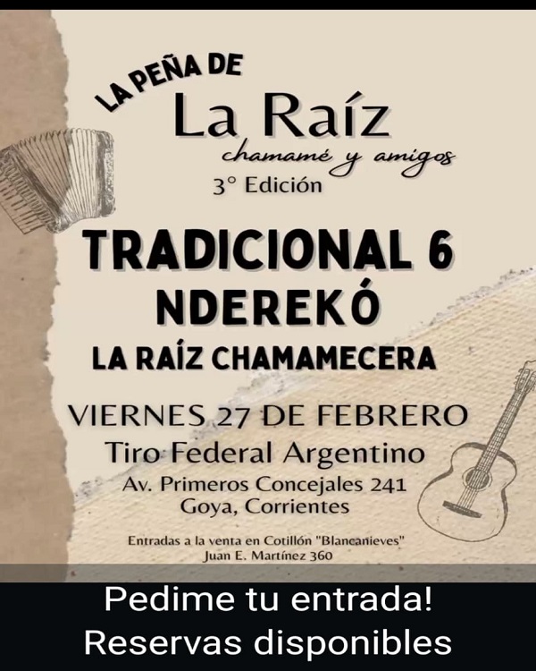 Una vez más nos vamos a encontrar entre amigos y chamamé. Esta vez acompaña a La Raíz Chamamecera, el grupo Tradicional 6 desde Mburucuyá trayendo chamame autentico y