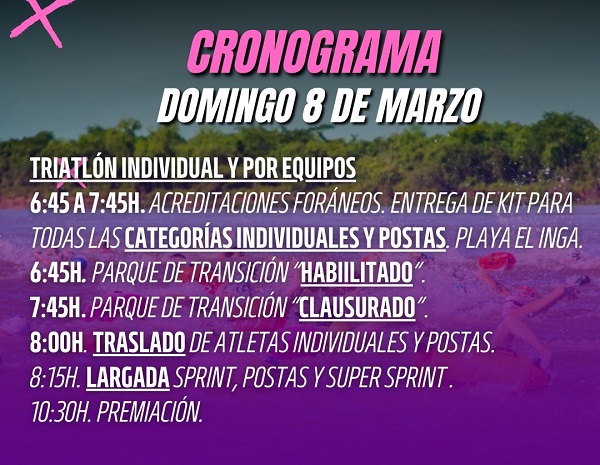 El sábado, desde las 18 horas se acreditará y entregará los kits a los deportistas que participarán de este desafío, el domingo desde las 8 horas, en Playa El Inga. Las modalidades son: Sprint, Por Equipo y Súper Sprint.