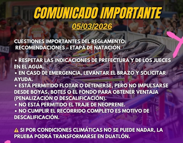 Se recuerda que, en caso de no permitirse la natación, la prueba se convertirá en Duatlón (Ciclismo y Pedestrismo).