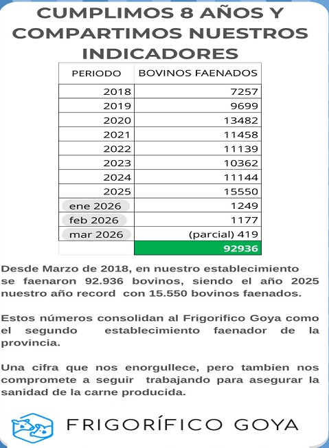 Desde su instalación, hace 8 años, la capacidad operativa refleja el crecimiento de producción en más de un 100% en faenas, en el 2018 se faenaron 7257, en 2025 se realizaron 15550 faenas. Estas estadísticas demuestran el desarrollo, en menos de 8 años, de la Planta Faenadora del Frigorífico Goya.