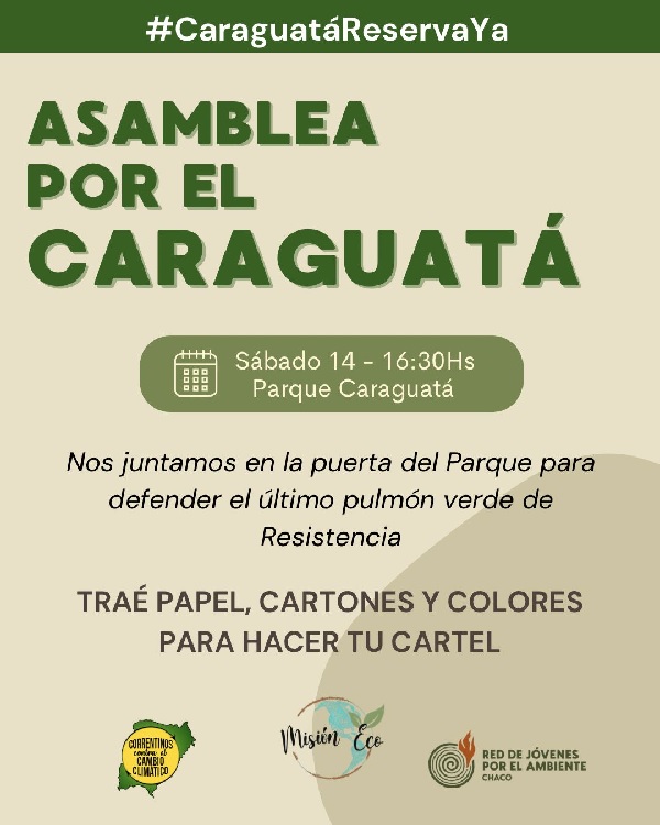 La asamblea se realizará este sábado 14 a las 16:30 horas, frente a la Reserva Caraguatá, y está abierta a toda la comunidad: vecinos de Resistencia, familias, estudiantes, organizaciones sociales y todas aquellas personas interesadas en la defensa del ambiente.