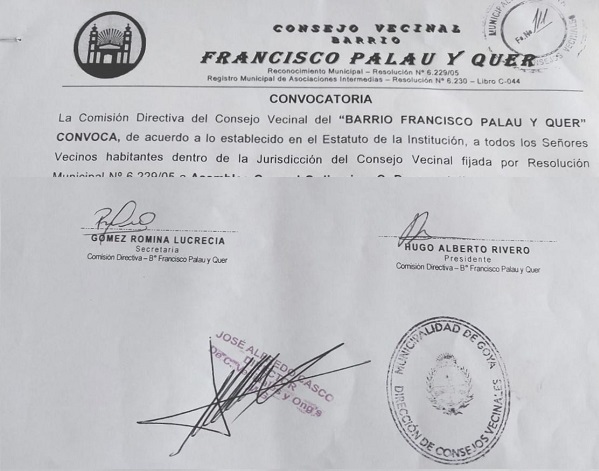 La Comisión Directiva del Consejo Vecinal del “BARRIO FRANCISCO PALAU Y QUER” CONVOCA, de acuerdo a lo establecido en el Estatuto de la Institución, a todos los Señores Vecinos habitantes dentro de la Jurisdicción del Consejo Vecinal fijada por Resolución Municipal N° 6.229/05 a Asamblea General Ordinaria – C. D. para el día martes, 31 de marzo de 2026a partir de las 20:00 horas en el Club Central Goya: