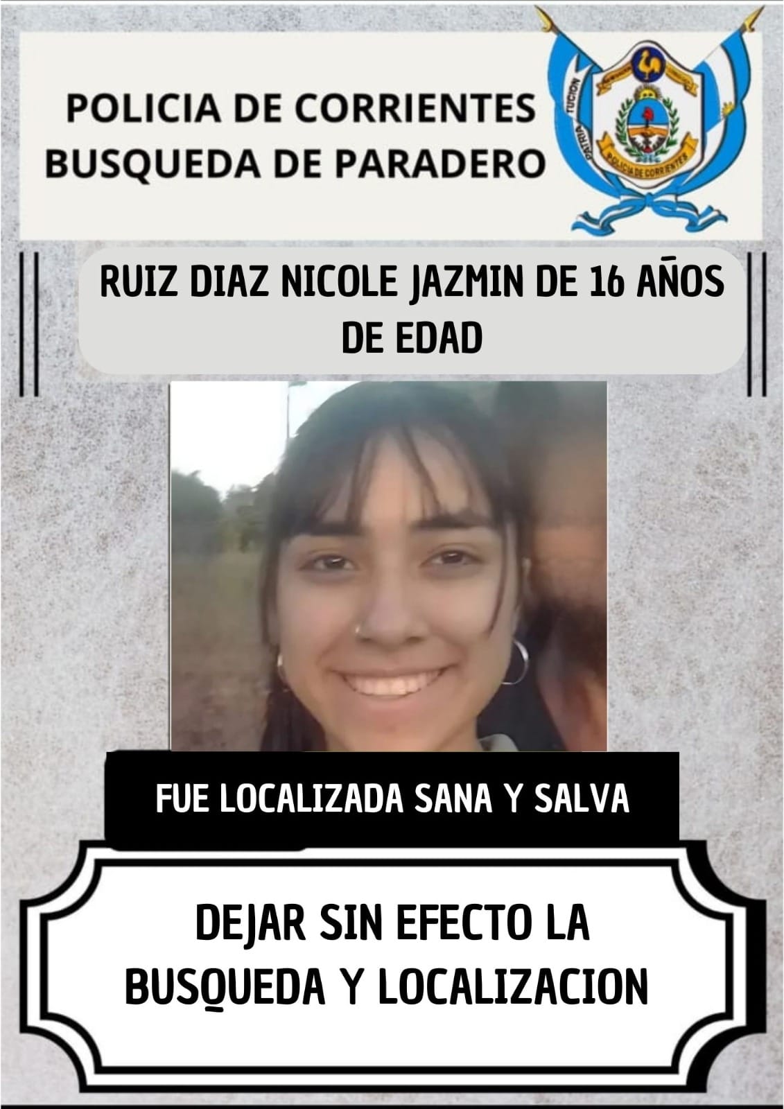 LA POLICÍA DE CORRIENTES LOCALIZÓ SANA Y SALVA A LA MENOR RUIZ DIAZ NICOLE JAZMIN DE 16 AÑOS DE EDAD, POR LO QUE SE DEJA SIN EFECTO EL PEDIDO DE BUSQUEDA Y LOCALIZACIÓN.