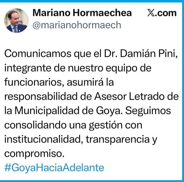 En la información descrita en sus redes, señala: “Comunicamos que el Dr. Damián Pini integrante de nuestro equipo de funcionarios, asumirá la responsabilidad de Asesor Letrado de la Municipalidad de Goya. Seguimos consolidando una gestión con institucionalidad, transparencia y compromiso”. #Goya hacia Adelante.