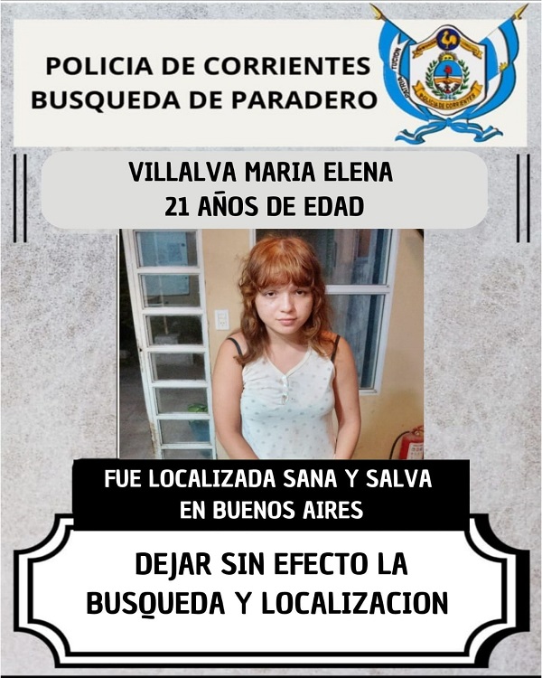 SIN EFECTO LA SOLICITUD DE PARADERO Y DE LOCALIZACION DE LA CIUDADANA VILLALBA MARIA ELENA DE 21 AÑOS DE EDAD, solicitado oportunamente por la Comisaria de distrito Segunda de Mercedes. Cabe señalar que, la misma fue localizada sana y salva, en la ciudad de La Plata – Buenos Aires, cuya situación ya tomó conocimiento la autoridad fiscal interviniente. (Solicitud enviada oportunamente, desde este Departamento de Relaciones Institucionales mediante Gacetilla Policial de fecha 15-03-26).