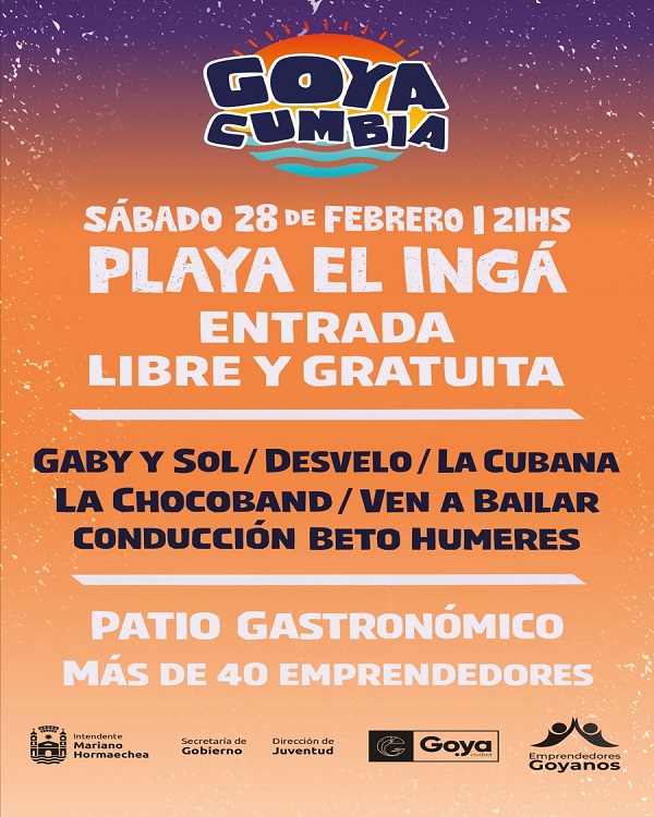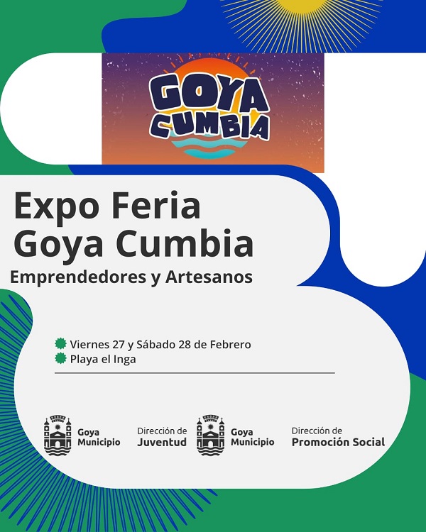 Con entrada libre y gratuita la propuesta de la Municipalidad de Goya, desde la Dirección de Juventud, se recomienda asistir con sus silletas, con muchas ganas de divertirse y disfrutar del show de las bandas en vivo, creando un espacio para promover la economía social con la Expo Feria “Goya Cumbia” donde artesanos y emprendedores pondrán a consideración del publico sus respectivas creaciones y elaboraciones.