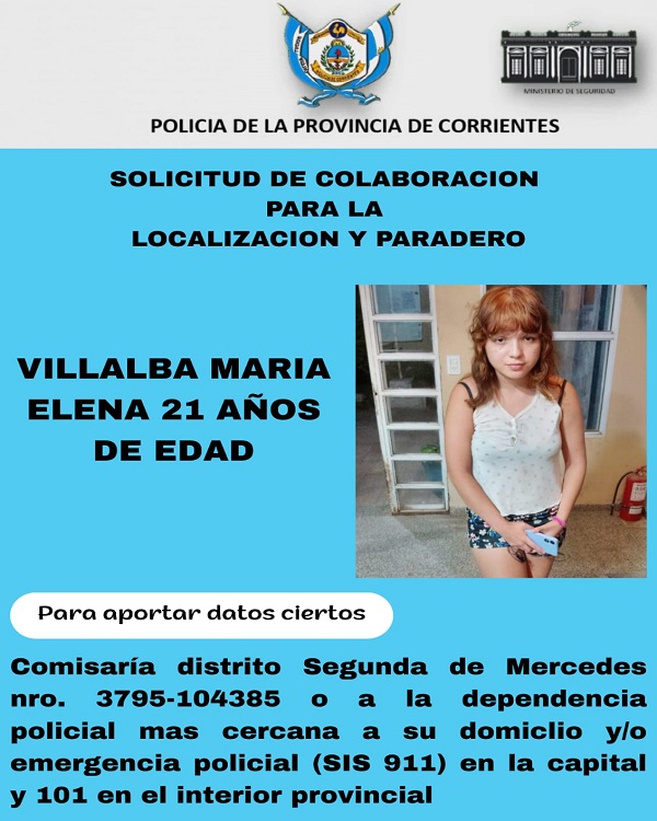 de Mercedes, a raíz de una denuncia realizada por una mujer de apellido Aguirre, por lo que solicitan la colaboración para dar difusión respecto a la búsqueda y localización de una ciudadana identificada como VILLALBA MARIA ELENA DE 21 AÑOS DE EDAD, quien se habría ausentado de su hogar ubicado en el Barrio Itati de esa localidad desde el pasado 10-03-26 en horas de la tarde.
