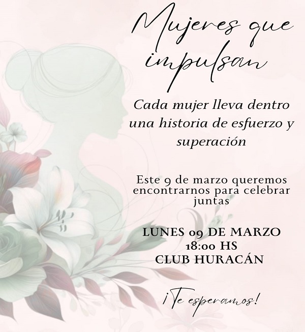 Bajo la consigna “Mujeres que Impulsan”, donde expresan, cada Mujer lleva dentro una Historia de Esfuerzo y Superación, se invita a participar del encuentro, este lunes 9 de marzo a las 18 horas, en los salones del Club Huracán.