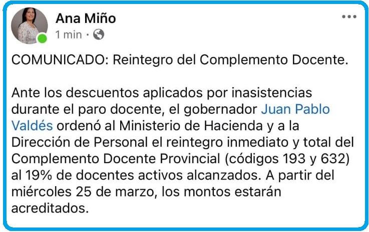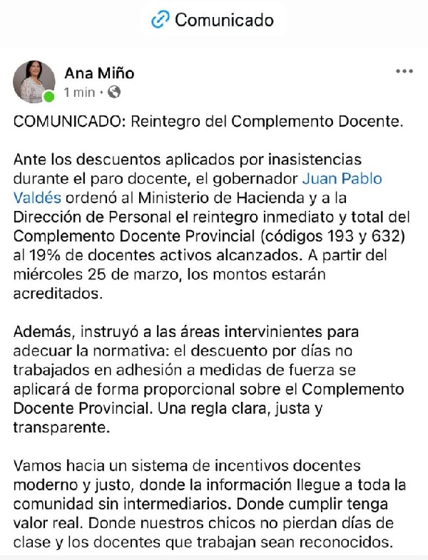 Ante los descuentos aplicados por inasistencias durante el paro docente, el gobernador Juan Pablo Valdés ordenó al Ministerio de Hacienda y a la Dirección de Personal el reintegro inmediato y total del Complemento Docente Provincial (códigos 193 у 632) al 19% de docentes activos alcanzados. A partir del miércoles 25 de marzo, los montos estarán acreditados.