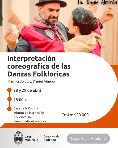 El artista musical, bailarín y docente, Daniel Almirón, vuelve a Goya para ofrecer una serie de clases magistrales sobre folklore y escenografía. El reconocido percusionista invita para el 28 de abril a un taller sobre “danzas folclóricas tradicionales y el abordaje de una porción del repertorio de danzas argentinas y efemérides” a las 19:30 horas.