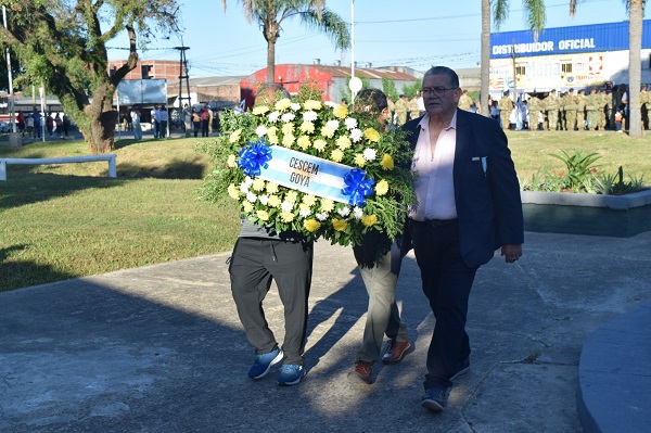 Por su parte, el Centro de Ex Combatientes de Malvinas (CESCEM) Goya también dijo presente con su ofrenda floral, la cual fue depositada por los veteranos Roque Zabala, Hugo Benítez y Juan Desiderio Barbona, en un gesto cargado de memoria y reconocimiento.