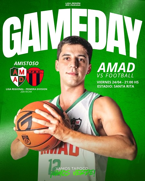 Este viernes 24 de abril, el plantel de primera división del club AMAD tendrá un amistoso con Esquina Football Club a partir de la hora 21, como partido preliminar del encuentro que mantendrán Santa Rita y la Sociedad Sportiva Esquinense, en el marco de la Liga Región Río Paraná, que disputan los equipos de esa localidad y de la provincia de Entre Ríos. En tanto AMAD que cuenta con la dirección técnica del Tano López Ríos, está jugando el Torneo Apertura de Primera División de la Asociación Goyana de Basquetbol AGDB.