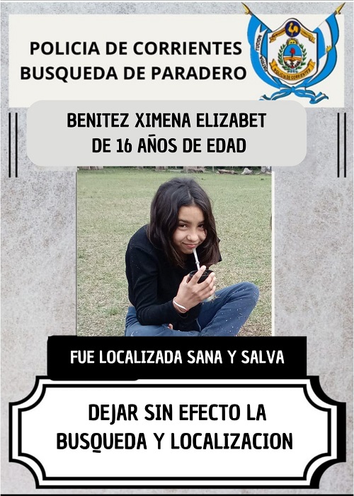 EN MONTE CASEROS – La Policía de Corrientes localizó sana y salva a la menor Benítez Ximena Elizabet de 16 años de edad, por lo que se deja sin efecto el pedido de búsqueda