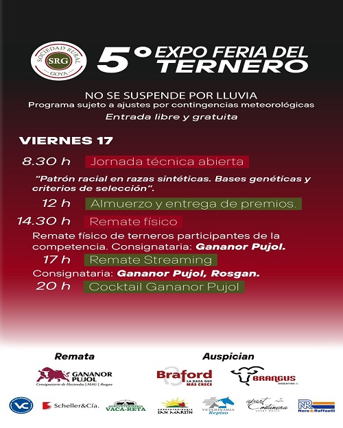La 5ª Edición de la Expo Feria del Ternero se desarrollará hasta el viernes 17 en las instalaciones de la Sociedad Rural de Goya, ubicadas en Paraje Zorzalito. El programa completo incluye: