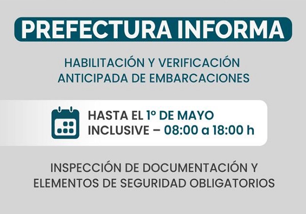 El operativo se llevará a cabo hasta el viernes 1 de mayo inclusive, en el horario de 8 a 18 horas. Durante estas jornadas, el personal de Prefectura realizará la inspección de la documentación correspondiente de cada embarcación, así como también el control de los elementos de seguridad obligatorios exigidos para la navegación.
