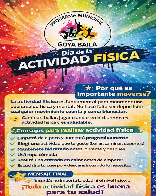 El Programa Municipal “Goya Baila” realizará una jornada recreativa el día viernes 10 de abril en la Rotonda de Acceso Norte a Goya, a las 18 hs, con motivo de recordar hoy lunes 6 de abril el Día de la Actividad Física y el 7 de abril Día Internacional de la Salud.