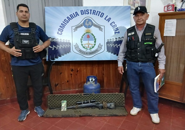 Quién denunció que en su ausencia de su domicilio por fallecimiento de su madre, personas desconocidas ingresaron de manera ilícita y se sustrajeron varios elementos entre ellos 01 arma de fuego carabina calinre 22 mm, registrada a su nombre, 01 teléfono celular y una garrafa de 10kg , ante ello personal de de investigaciones a cargo del oficial Niz y del sub oficial mayor Niz comenzó a realizar las primeras averiguaciones en materia investigativas, logrando localizar el arma de fuego denunciada, que fuera adquirida por una persona quien hizo entrega de forma voluntaria, tratándose del entorno familiar del damnificado, quien sin impedimento alguno hace entrega del elemento lo cual fue secuestrado bajo acta luego por instrucciones del fiscal. Mediante acta de exhibición y reconocimiento es restituido al denunciante de autos quien acredita la propiedad de los elementos sustraídos.-