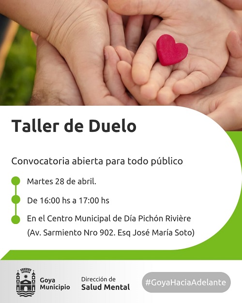 Se invita a participar del taller de duelo, la convocatoria abierta a la comunidad está previsto para el martes 28 de abril, desde las 16 horas, en el Centro de Día Municipal “Pichón Riviere” (Av. Sarmiento N° 904, esquina José María Soto)