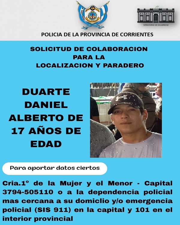 A través de la presente Gacetilla, solicitamos a los distintos medios de comunicación pueda ser reflejado-publicado sobre una solicitud enviada desde la Comisaría Primera de Mujer y el Menor, el día de ayer 02-04-26, quienes solicitan la colaboración para dar difusión respecto a la búsqueda y localización de un menor identificado como DUARTE DANIEL ALBERTO DE 17 AÑOS DE EDAD, quien conforme a la denuncia efectuada por una persona de apellido -Alarcon-; el mismo se encuentra ausente desde el día de la fecha, dando intervención de ésta situación también a la fiscalía de Investigación en turno.